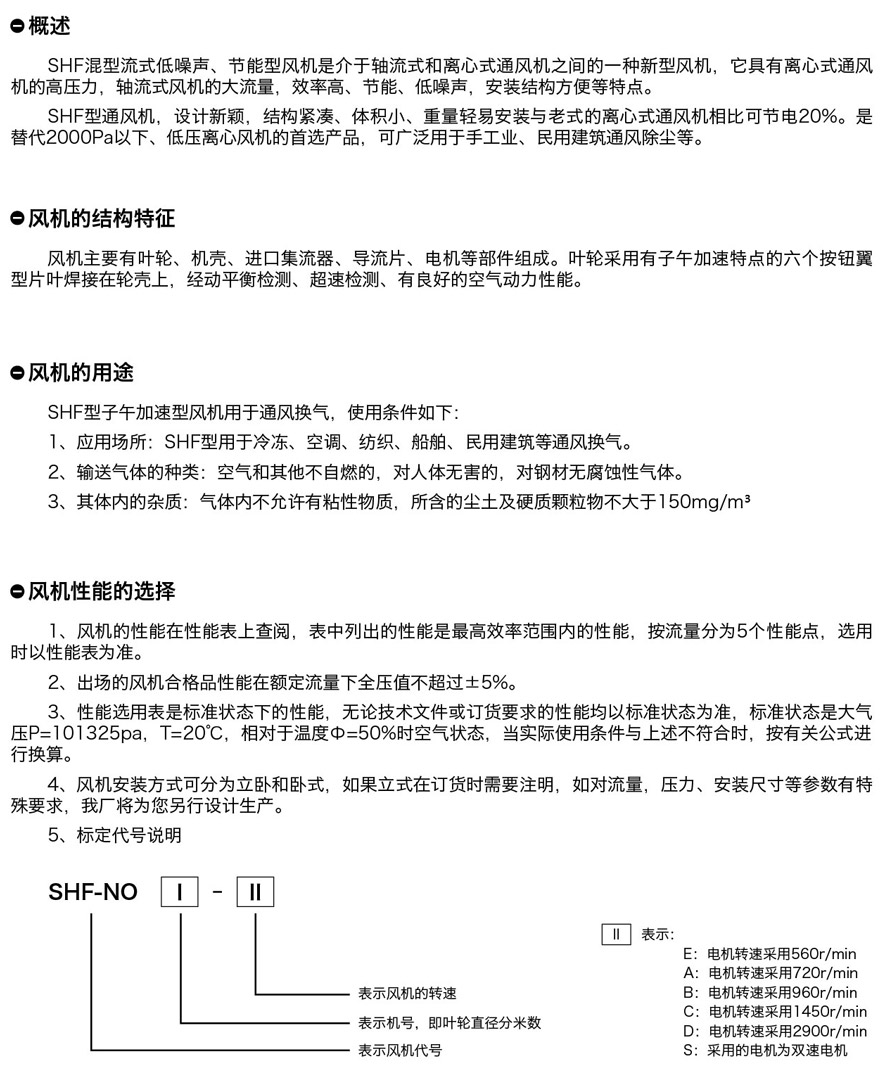 SHF混型流式低噪聲、節(jié)能型風機是介于軸流式和離心式通風機之間的一種新型風機, 它具有離心式通風 機的高壓力,軸流式風機的大流置,效率高、節(jié)能、低噪聲,安裝結(jié)構(gòu)方便等特點。 SHF型通風機,設計新穎,結(jié)構(gòu)緊湊、體積小、重置輕易安裝與老式的離心式通風機相比可節(jié)電20%。