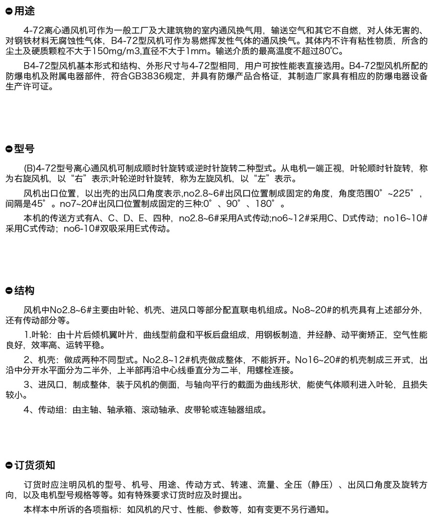 4-72離心通風(fēng)機(jī)可作為一般工廠及大建筑物的室內(nèi)通風(fēng)換氣用,輸送空氣和其它不自燃,對(duì)人體無(wú)害的、 對(duì)鋼鐵材料無(wú)腐蝕性氣體,B4-72型風(fēng)機(jī)可作為易燃揮發(fā)性氣體的通風(fēng)換氣。