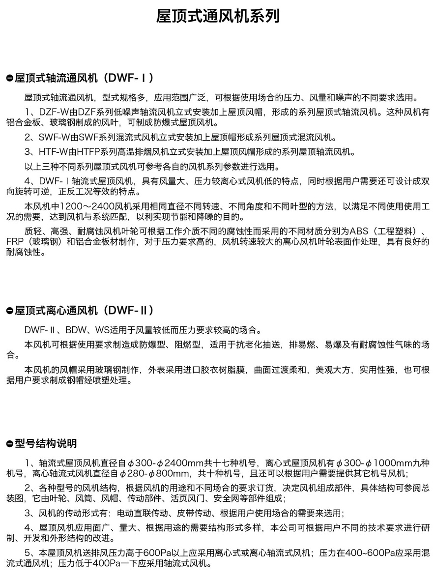 DWF- II、BDW、WS適用于風(fēng)置較低而壓力要求較高的場(chǎng)合。 本風(fēng)機(jī)可根據(jù)使用要求制造成防爆型、阻燃型,適用于抗老化抽送,排易燃、易爆及有耐腐蝕性氣味的場(chǎng) 合。 本風(fēng)機(jī)的風(fēng)帽采用玻璃鋼制作,外表采用進(jìn)口膠衣樹脂膜,曲面過渡柔和,美觀大方,實(shí)用性強(qiáng),也可根 據(jù)用戶要求制成鋼帽經(jīng)噴塑處理。